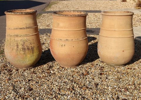 This set of three large French terracotta pots showcases traditional craftsmanship with their robust, earthy texture and classic design. Each pot features a timeless, rustic finish, making them ideal for both decorative and practical use. Perfect for garden enthusiasts or collectors, they add a touch of French elegance to any setting.
