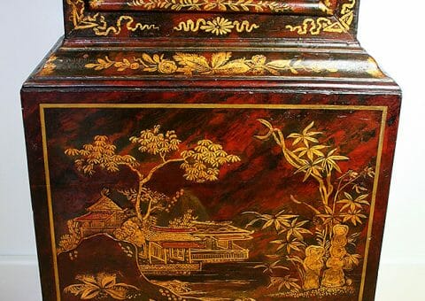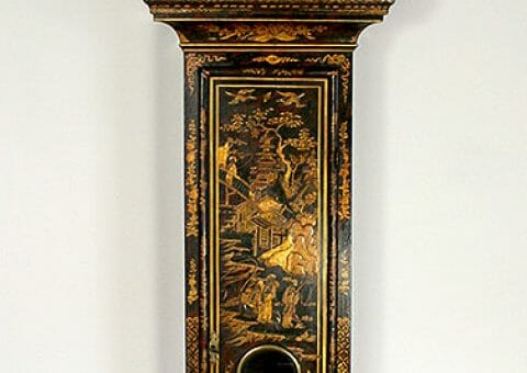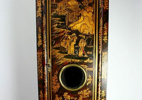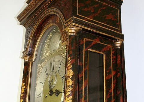 A Fine Early 18th-century red and black faux tortoiseshell longcase clock with exquisite gilt Lacquer front, the long door decorated in a classic Japanese garden scene the caddy top surmounted by two gold, gesso covered, wooden finials. 12″ arched dial brass dial with a finely matted centre, subsidiary seconds dial, and square box date aperture above the six o’clock position, with blued cut steel hands.