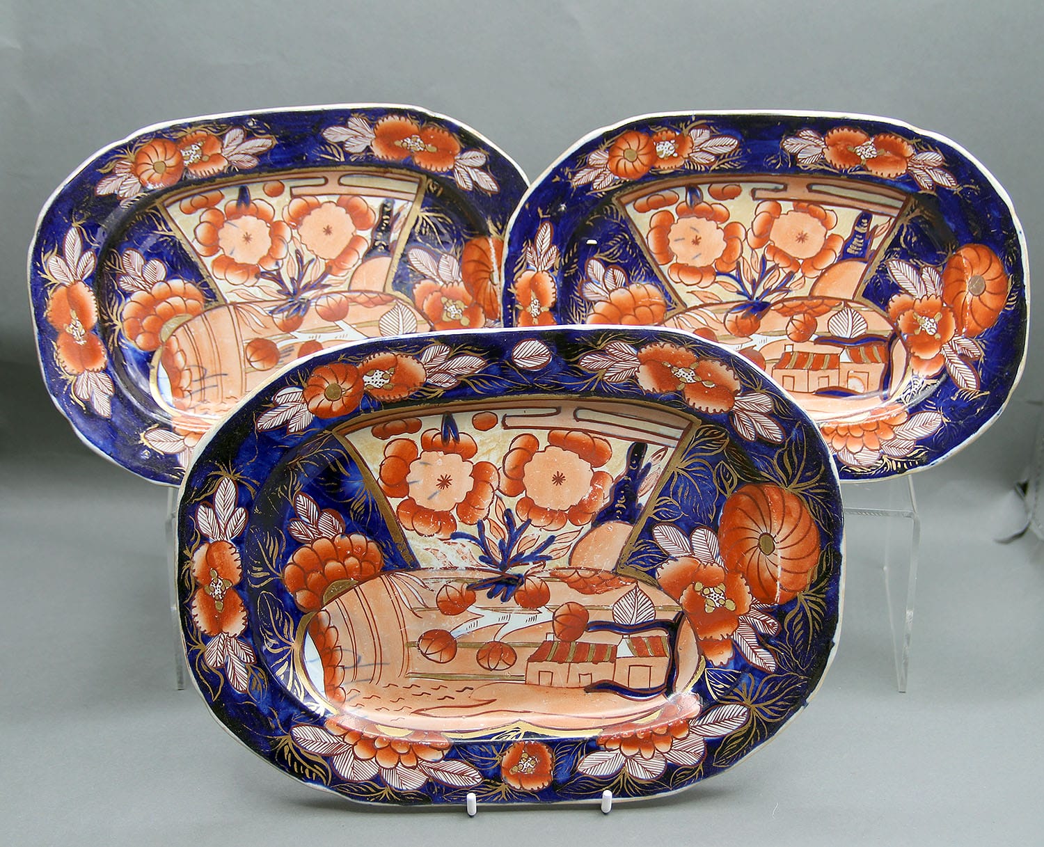 A trio of Mason’s Ironstone China Ashets, Decorated in the “Old School House” pattern, Unmarked. Circa 1813 – 1820.