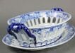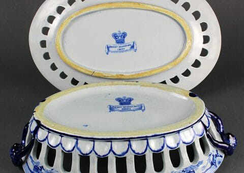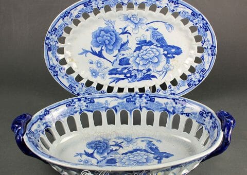 A Rare Mason’s Ironstone China chestnut basket and tray, decorated in the “Blue Pheasant” pattern, having the transfer blue mark to both pieces.