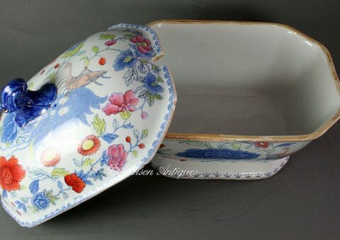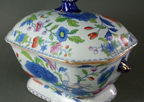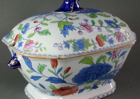 A Mason’s Ironstone China soup tureen, decorated in the “Indian Grasshopper” pattern, having the Patent Ironstone China Warranted mark to the base. Circa 1813 – 1820.