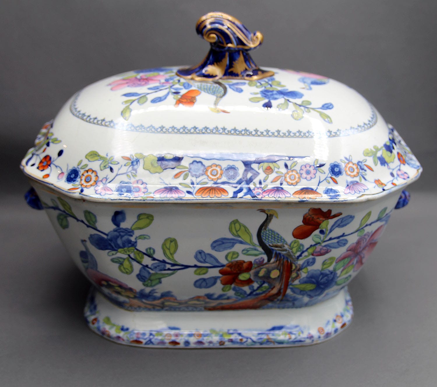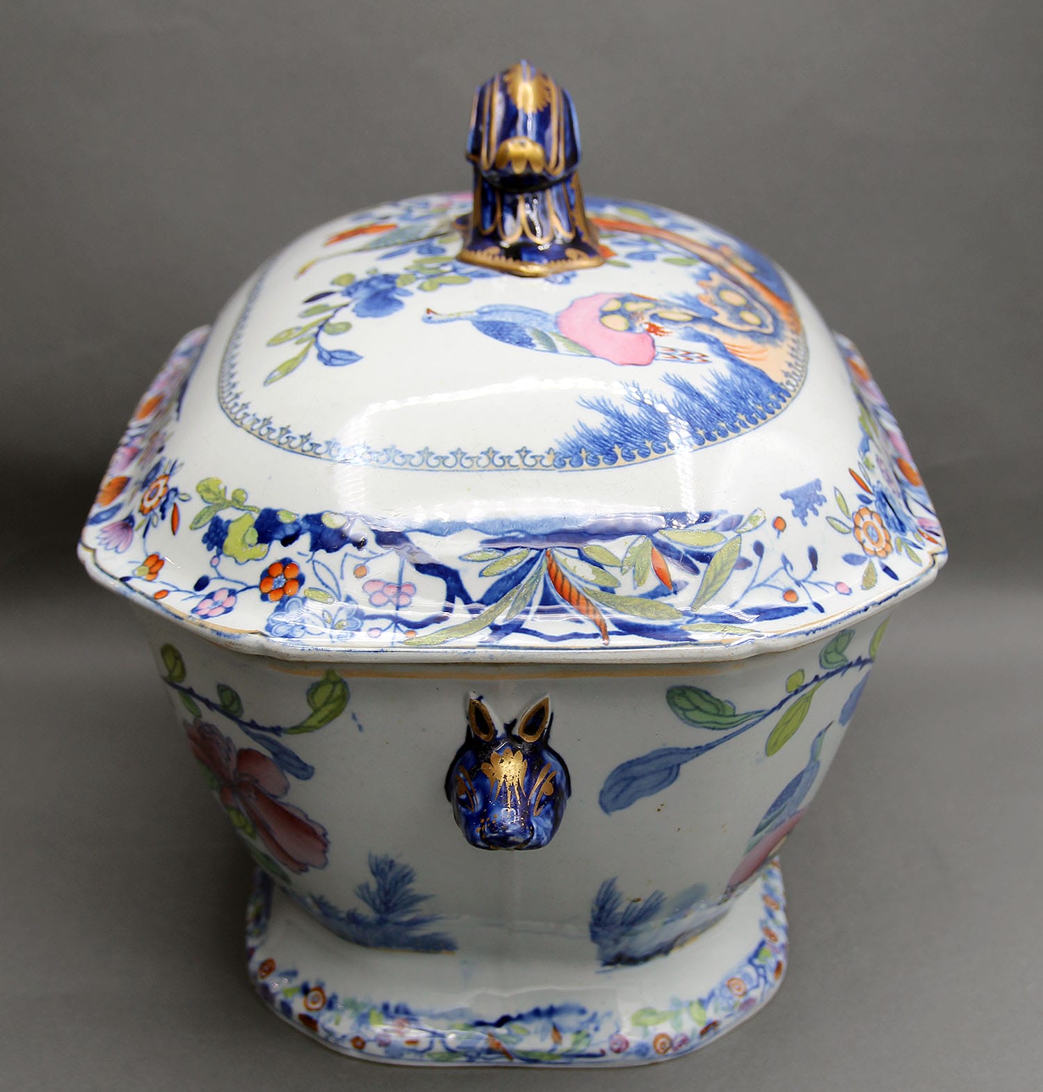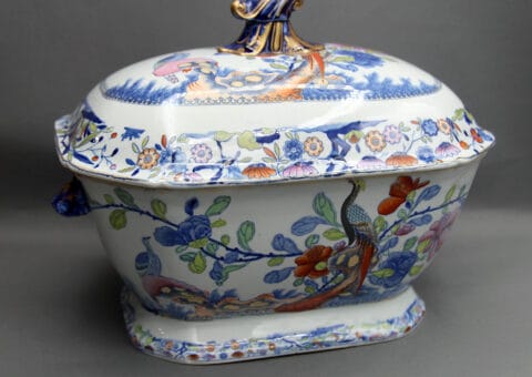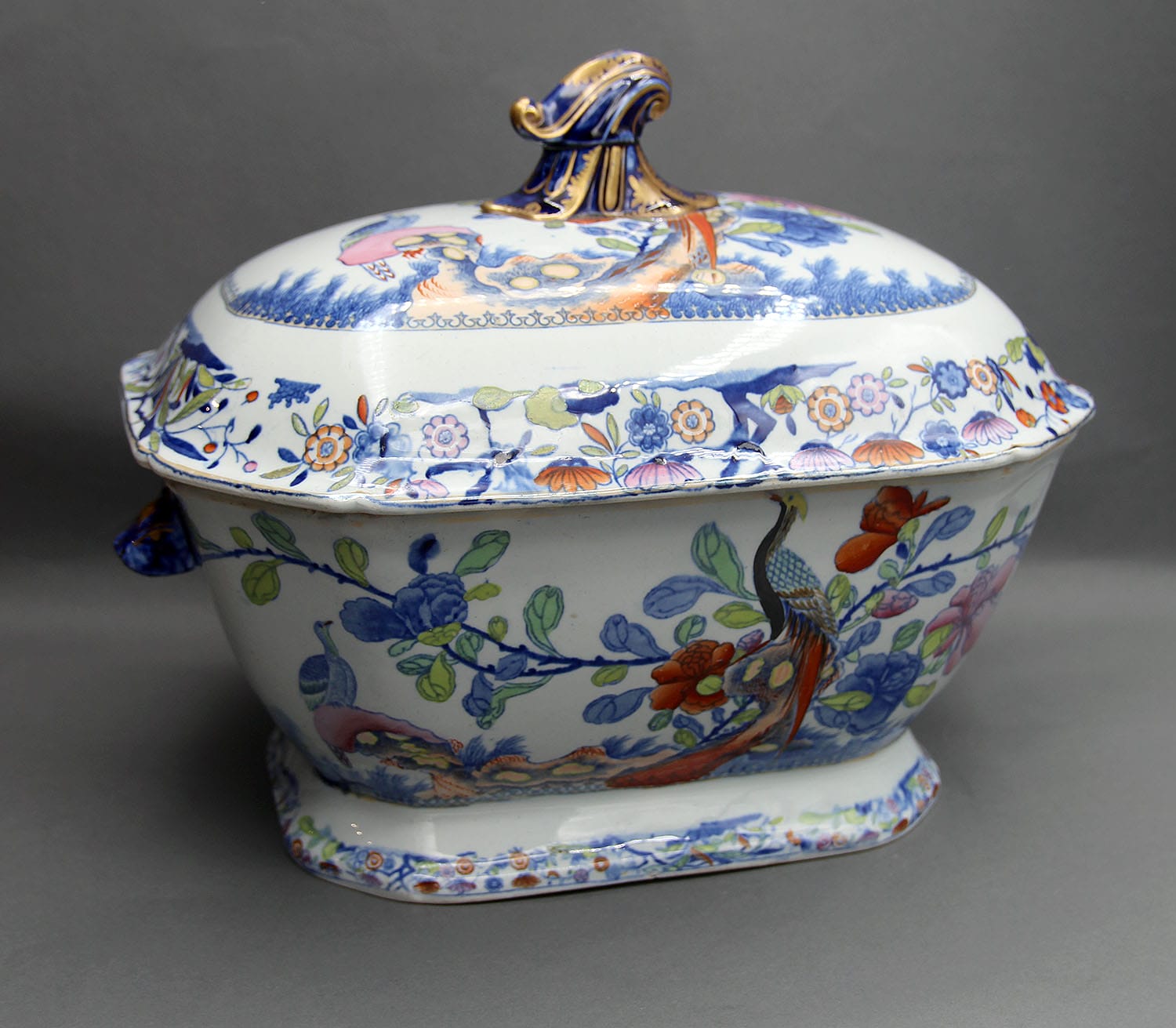 A Mason’s Ironstone China soup tureen, decorated in the “Long-Tailed Bird” pattern, having the blue transfer crown mark. Circa 1815 – 1825.