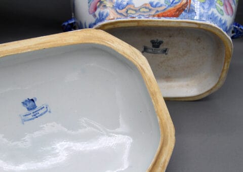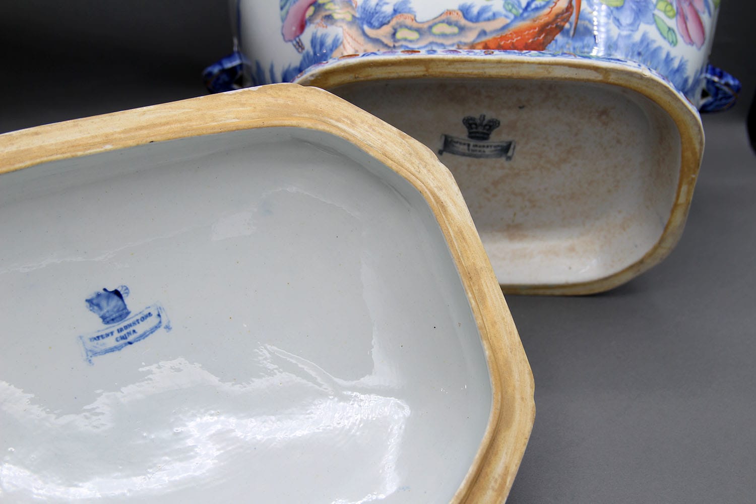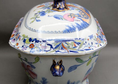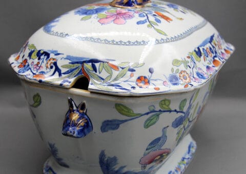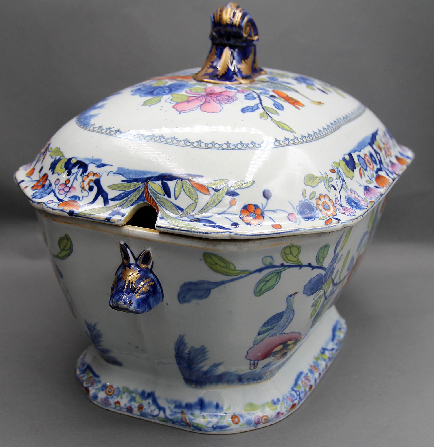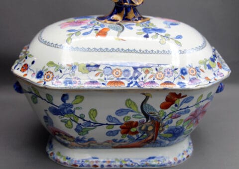 A Mason’s Ironstone China soup tureen, decorated in the “Long-Tailed Bird” pattern, having the blue transfer crown mark. Circa 1815 – 1825.