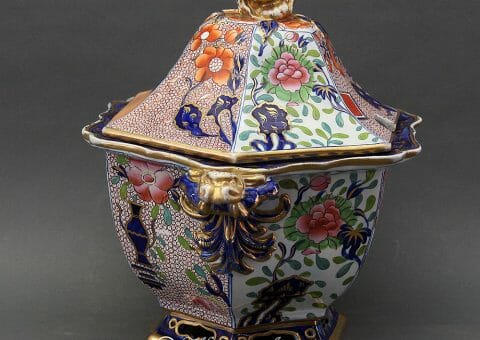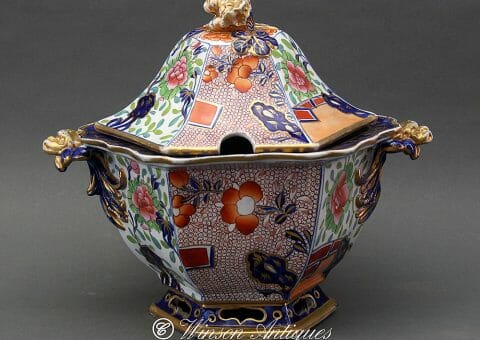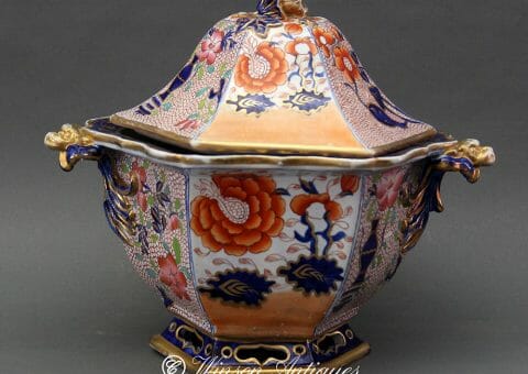 This Mason’s Ironstone China octagonal soup tureen features a unique geometric design that sets it apart from more traditional shapes. Crafted in the early 19th century, it combines intricate detailing with the robust durability of Mason’s Ironstone. Its distinctive octagonal form and elegant craftsmanship make it a standout piece for collectors.