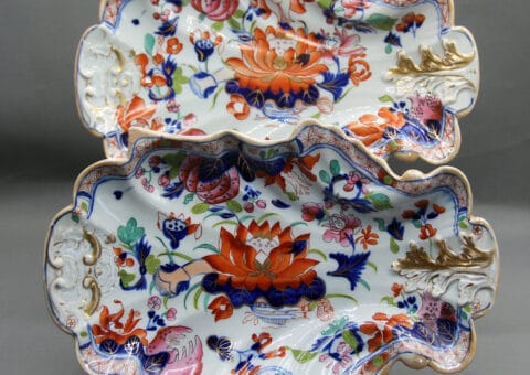 This pair of Mason’s Ironstone China dessert dishes features the graceful Water Lily pattern, with delicate floral designs. Dating to the early 19th century, these dishes blend artistic elegance with the durability of Mason’s Ironstone. Perfect for collectors, they add a touch of sophistication to any table setting.