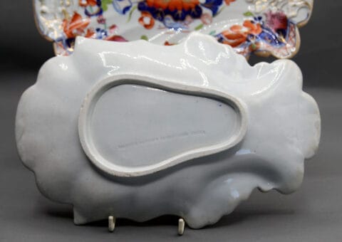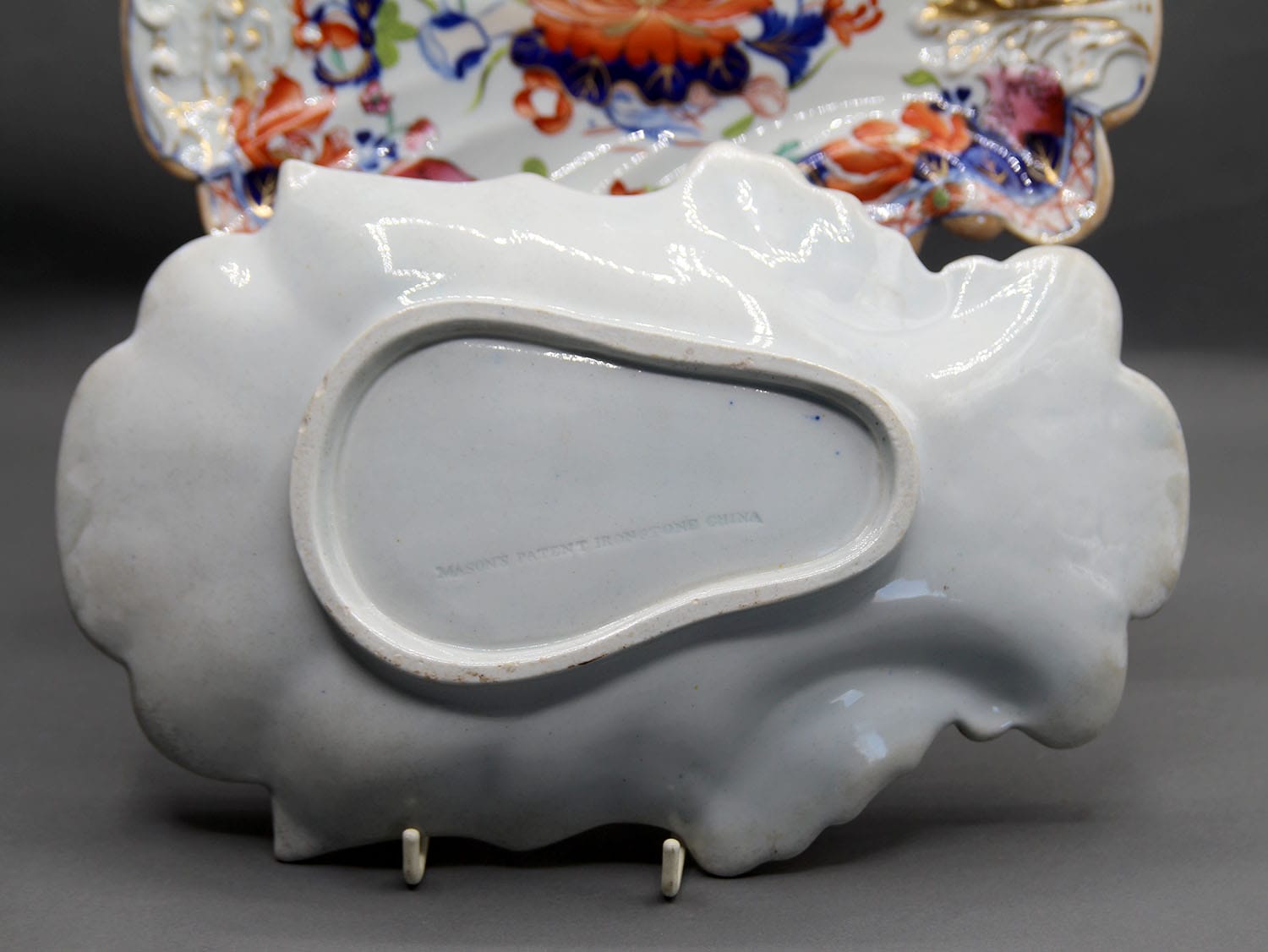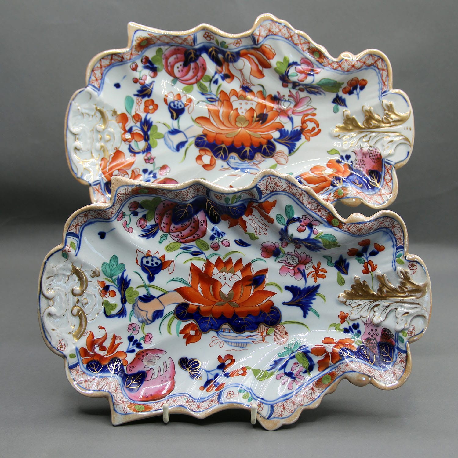 A pair of Mason’s Ironstone China leaf-shaped dessert dishes, Decorated in the “Water Lily” pattern, having the single impressed line mark to the underside. Circa 1813 – 1820.