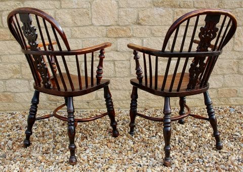 A rare pair of yew wood Windsor low back armchairs, Circa 1820 – 1860, having a pierced centre splat, supported by an elm seat and turned legs united with a crinoline stretcher, having lovely colour and patination.